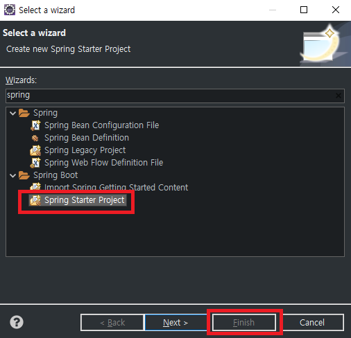 2-2. spring boot > spring starter project 를 클릭하고 finish 클릭