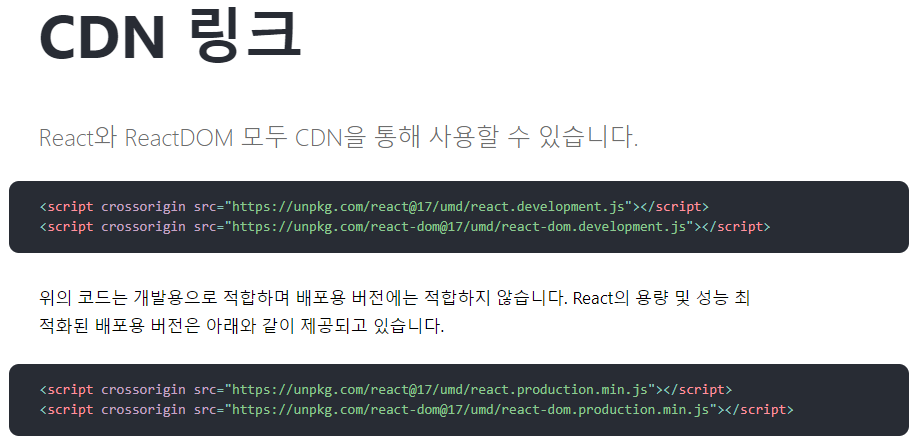 위 사이트에서 링크의 문서로 들어가면 CDN 링크가 있다. 개발용과 배포용을 헷갈리지 말도록 하자.
